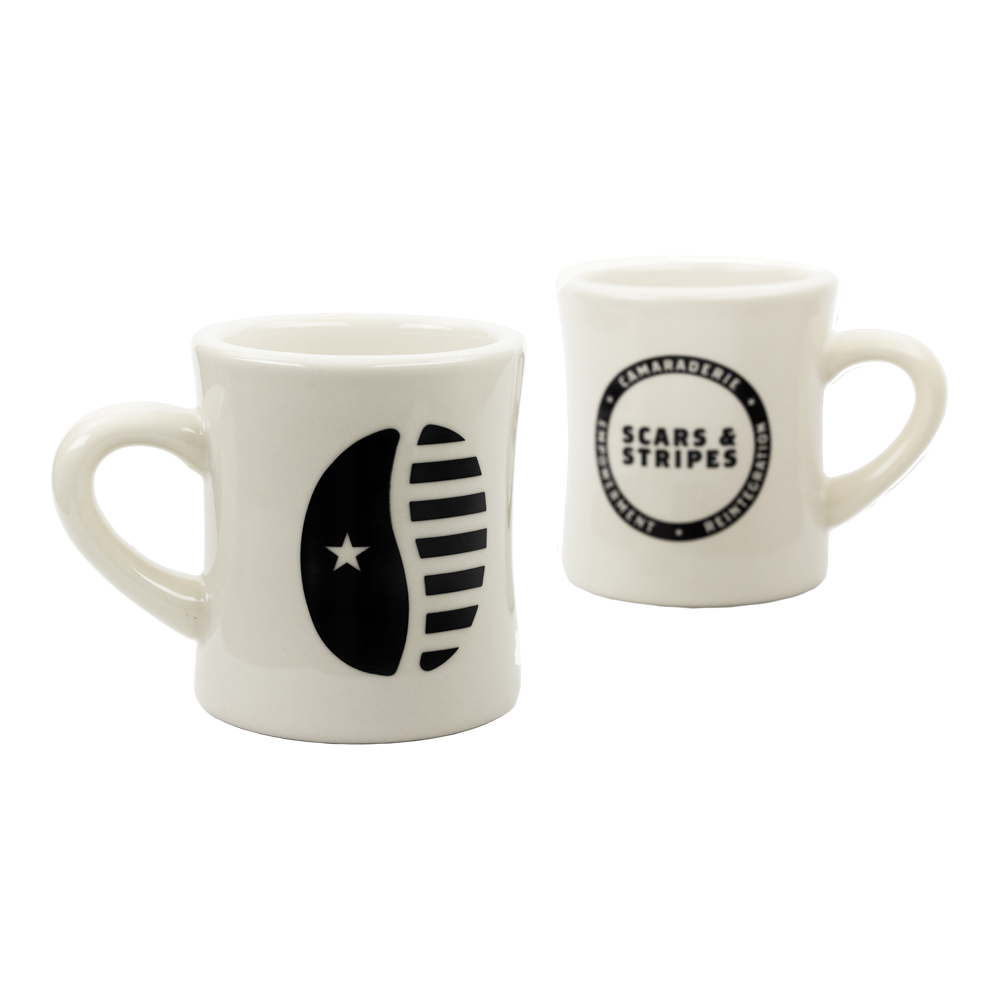 Enjoy a cup of Scars & Stripes Coffee in our latest mug. Featuring our mission; Camaraderie, Reintegration, & Empowerment.